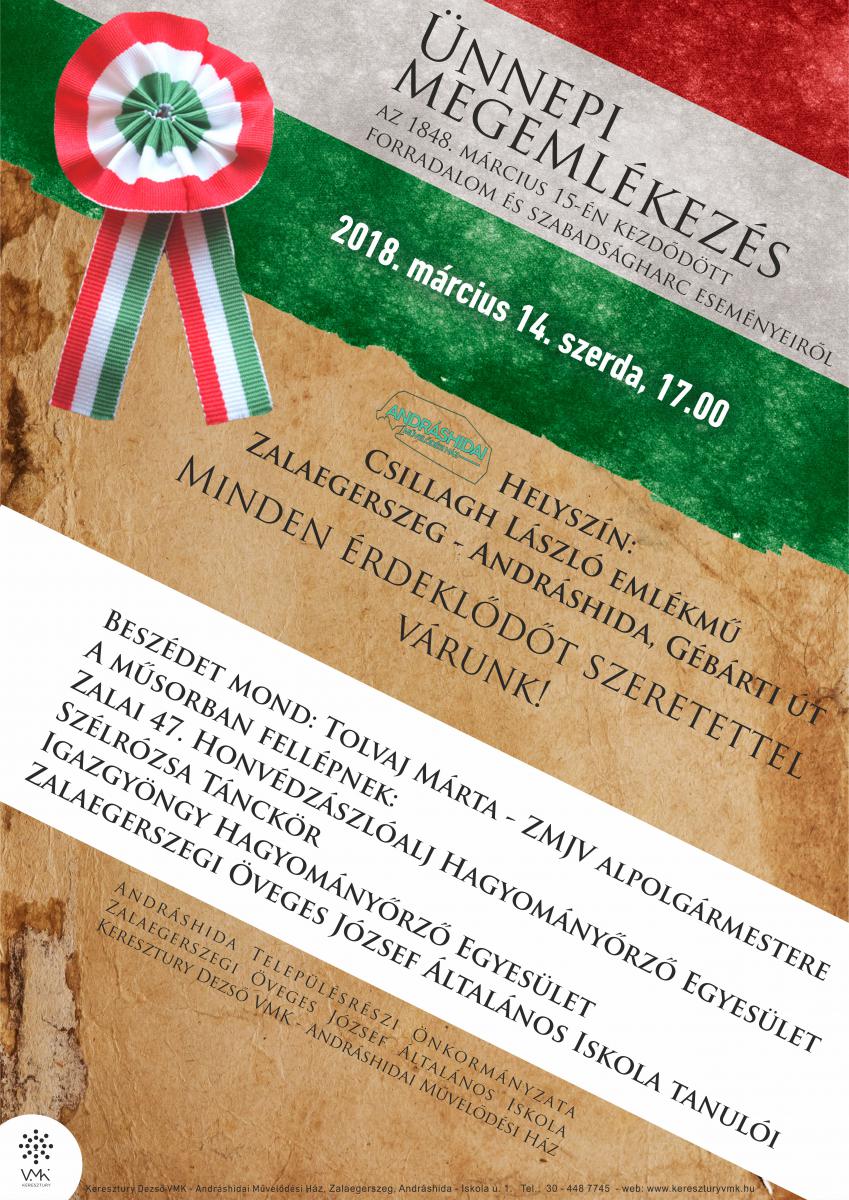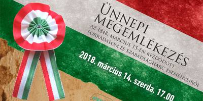 Az 1848-as forradalom és szabadságharc eseményeiről, hőseiről emlékezünk az iskolásokkal, s a felnőtt civil csoportokkal együtt, majd elhelyezzük a megemlékezés koszorúját. Történelmi műsorunk helyszíne: Gébárti út, Csillagh László emlékmű.