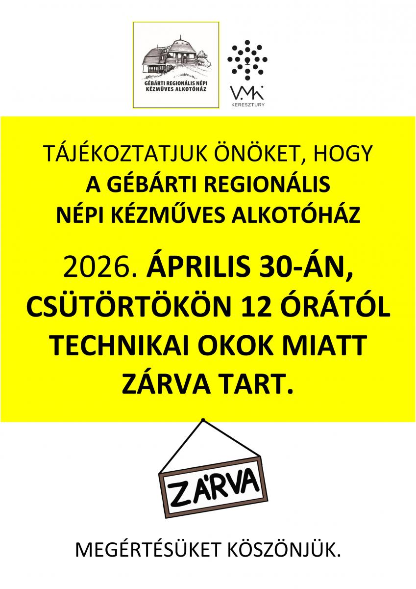 GÉBÁRTI ALKOTÓHÁZ ÁPRILIS 30-ÁN, CSÜTÖRTÖKÖN 12 ÓRÁTÓL TECHNIKAI OKOK MIATT ZÁRVA TART.