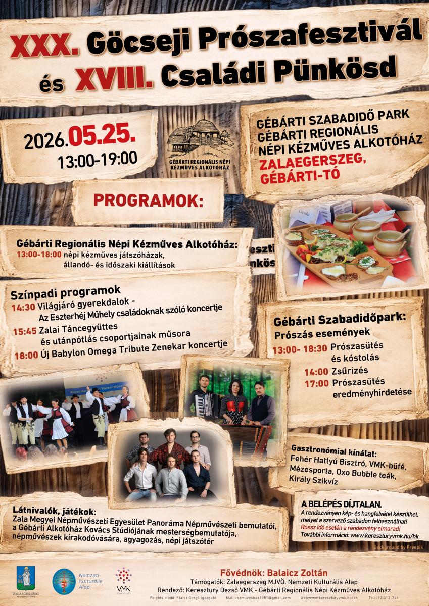 Várjuk baráti társaságok, klubok, munkahelyi közösségek és egyéb szerveződő csapatok jelentkezését a XXX. Göcseji Prószafesztiválra, melyet 2026. május 25-én, pünkösdhétfőn 13:00 órától tartunk a Gébárti Szabadidő Park területén.