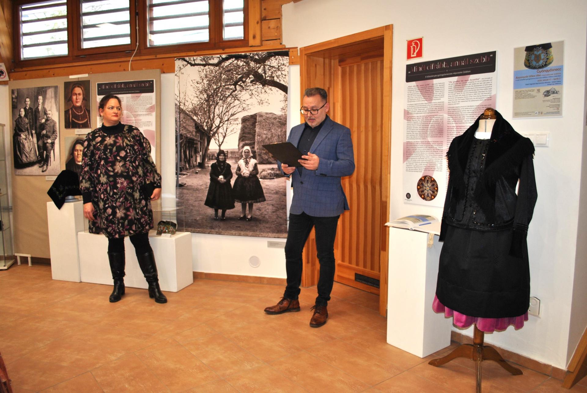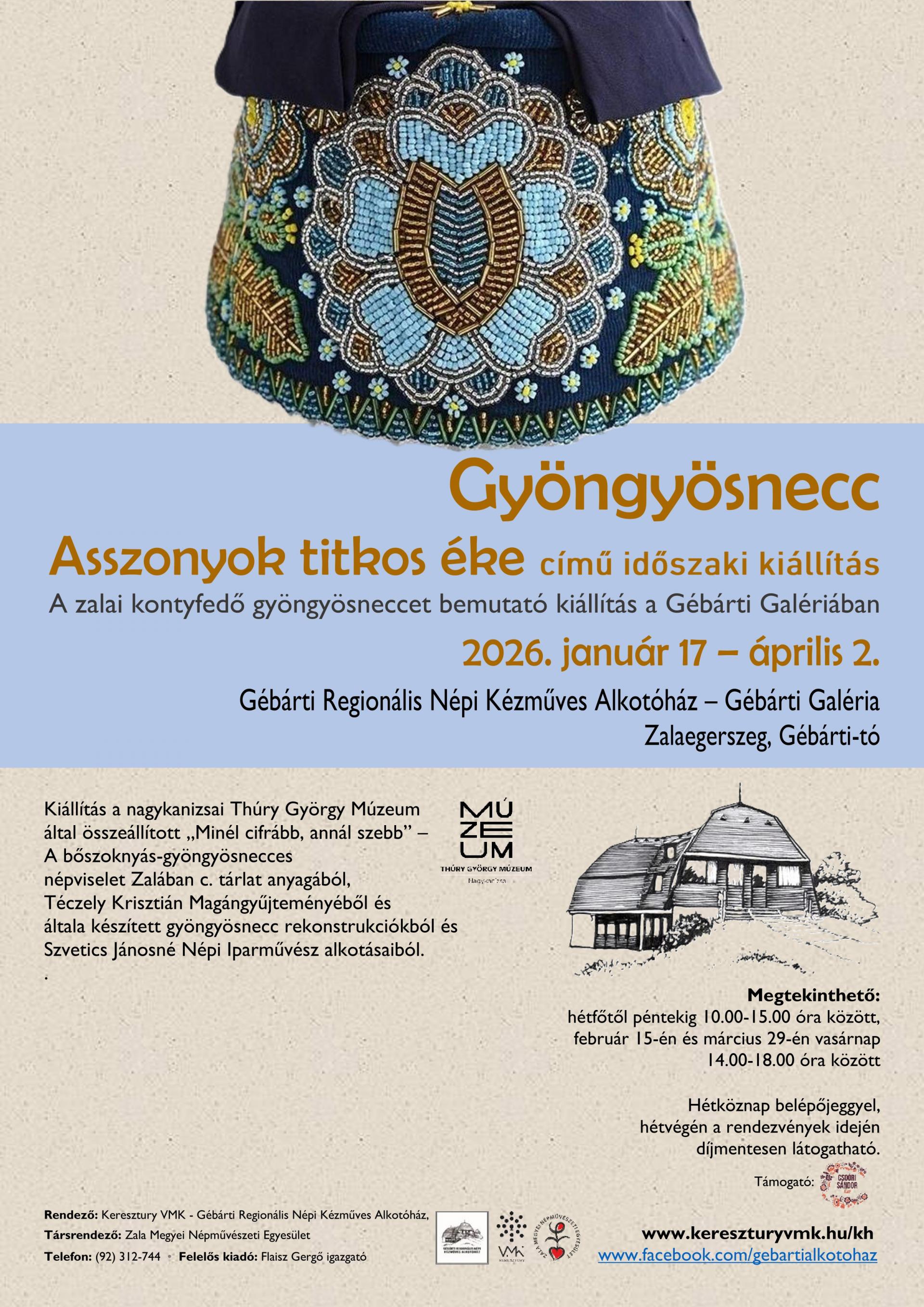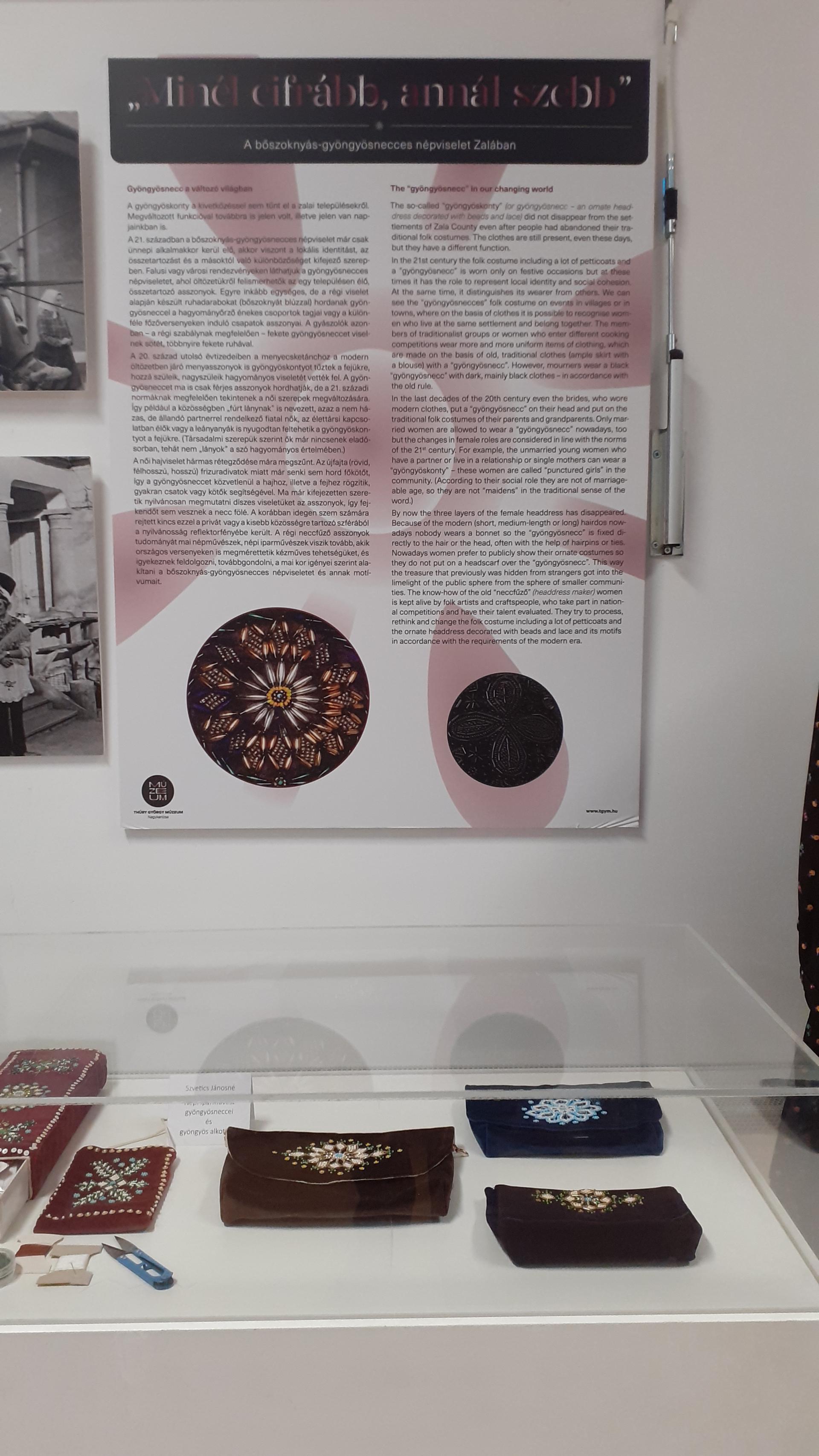 Kiállítás a nagykanizsai Thúry György Múzeum által összeállított „Minél cifrább, annál szebb” – A bőszoknyás-gyöngyösnecces népviselet Zalában c. tárlat anyagából, Téczely Krisztián Magángyűjteményéből és általa készített gyöngyösnecc rekonstrukciókból és Szvetics Jánosné Népi Iparművész alkotásaiból.