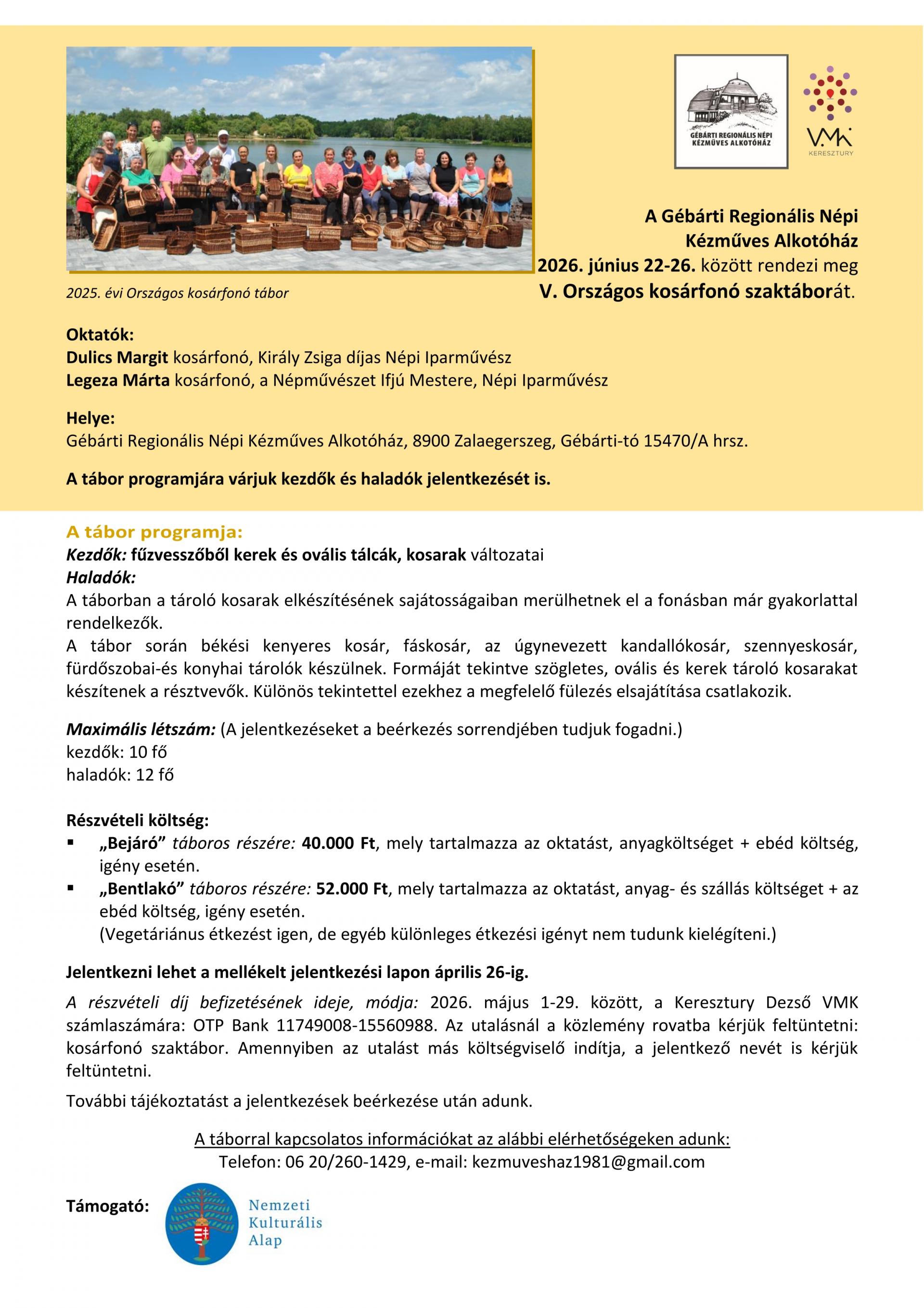 Az utalásnál a közlemény rovatba kérjük feltüntetni: kosárfonó szaktábor. Amennyiben az utalást más költségviselő indítja, a jelentkező nevét is kérjük feltüntetni.