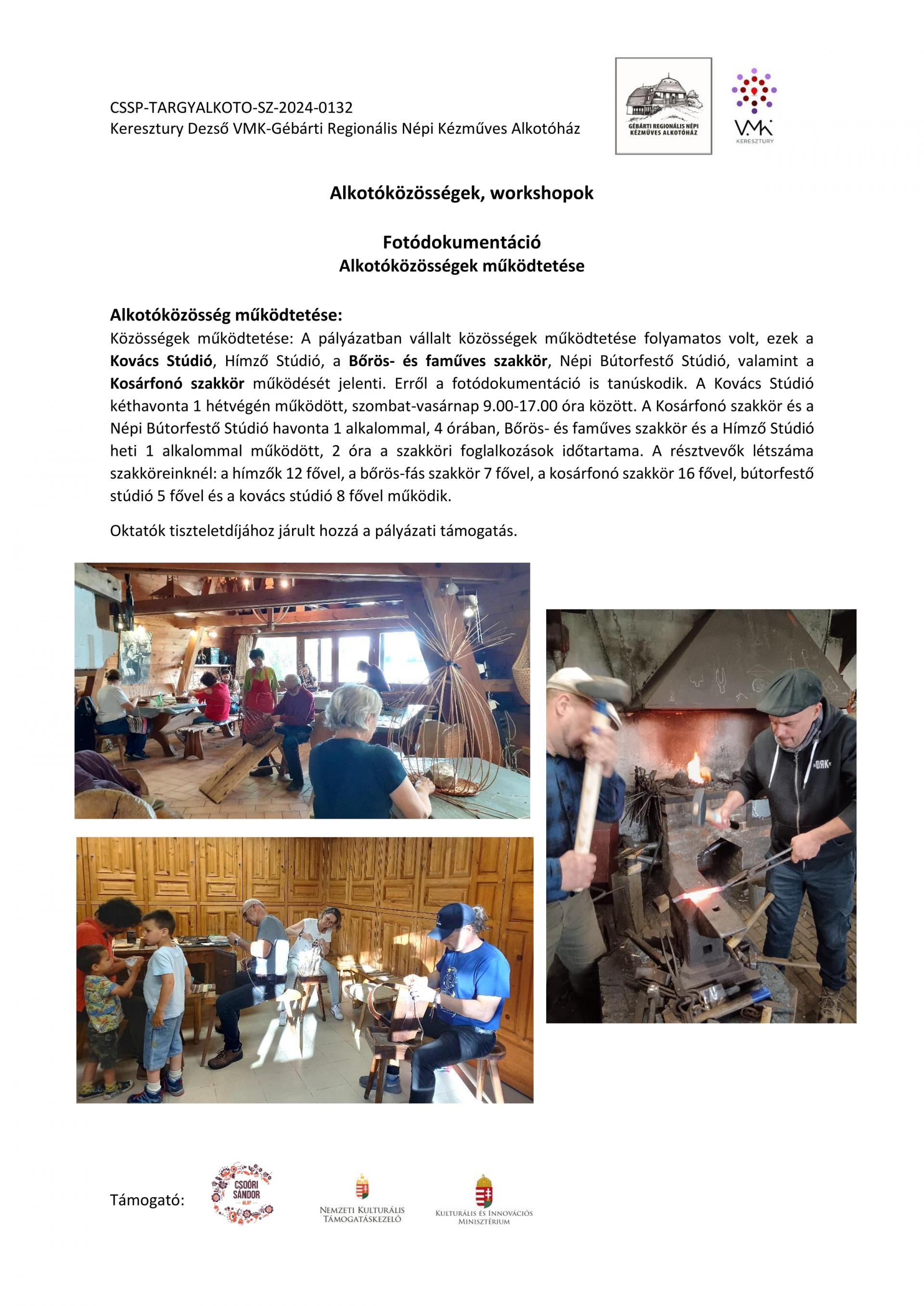 Közösségek működtetése: A pályázatban vállalt közösségek működtetése folyamatos volt, ezek a Kovács Stúdió, Hímző Stúdió, a Bőrös- és faműves, Népi Bútorfestő Stúdió, valamint a Kosárfonó szakkör működését jelenti. Erről a fotódokumentáció is tanúskodik. A Kovács Stúdió kéthavonta 1 hétvégén működött, szombat-vasárnap 9.00-17.00 óra között. A Kosárfonó szakkör és a Népi Bútorfestő Stúdió havonta 1 alkalommal, 4 órában, Bőrös- és faműves szakkör és a Hímző Stúdió heti 1 alkalommal működött, 2 óra a szakköri foglalkozások időtartama. A résztvevők létszáma szakköreinknél: a hímzők 12 fővel, a bőrös-fás szakkör 7 fővel, a kosárfonó szakkör 16 fővel, bútorfestő stúdió 5 fővel és a kovács stúdió 8 fővel működik.