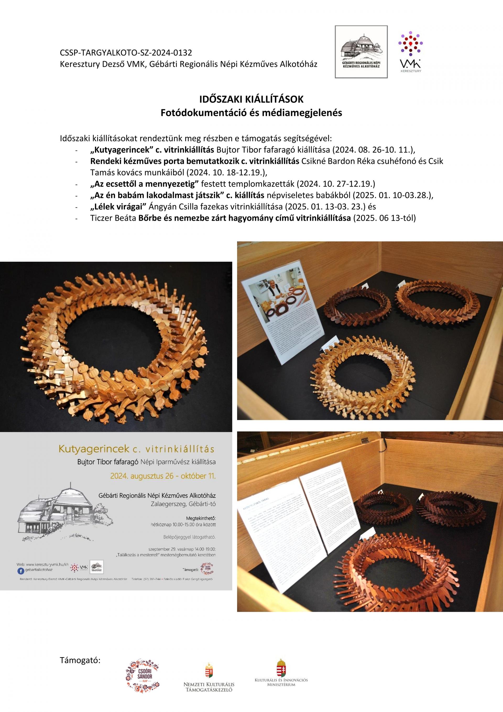 Időszaki kiállításokat rendeztünk meg részben e támogatás segítségével: „Kutyagerincek” Bujtor Tibor fafaragó kiállítása (2024. 08. 26-10. 11.), Rendeki kézműves porta bemutatkozik c. vitrinkiállítás (2024. 10. 18-12.19.), „Az ecsettől a mennyezetig” festett templomkazetták (2024. 10. 27-12.19.), „Az én babám lakodalmast játszik” c. kiállítás népviseletes babákból (2025. 01. 10-03.28.), „Lélek virágai” Ángyán Csilla fazekas vitrinkiállítása (2025. 01. 13-03. 23.) és Ticzer Beáta Bőrbe és nemezbe zárt hagyomány című vitrinkiállítása (2025. 06 13-tól).