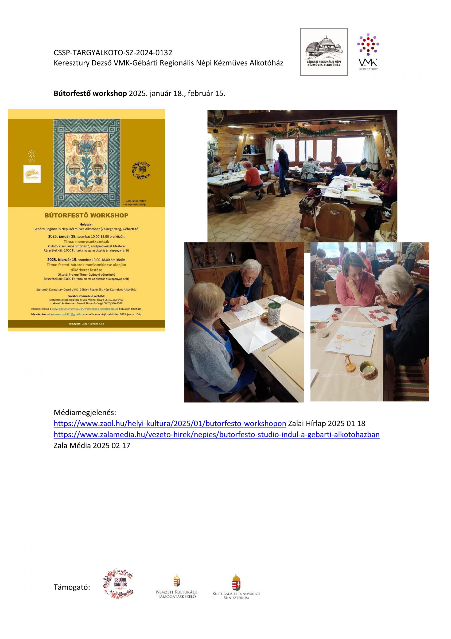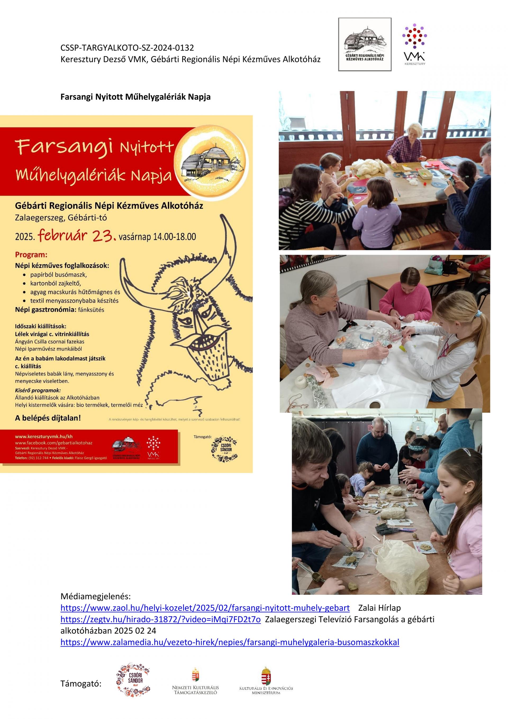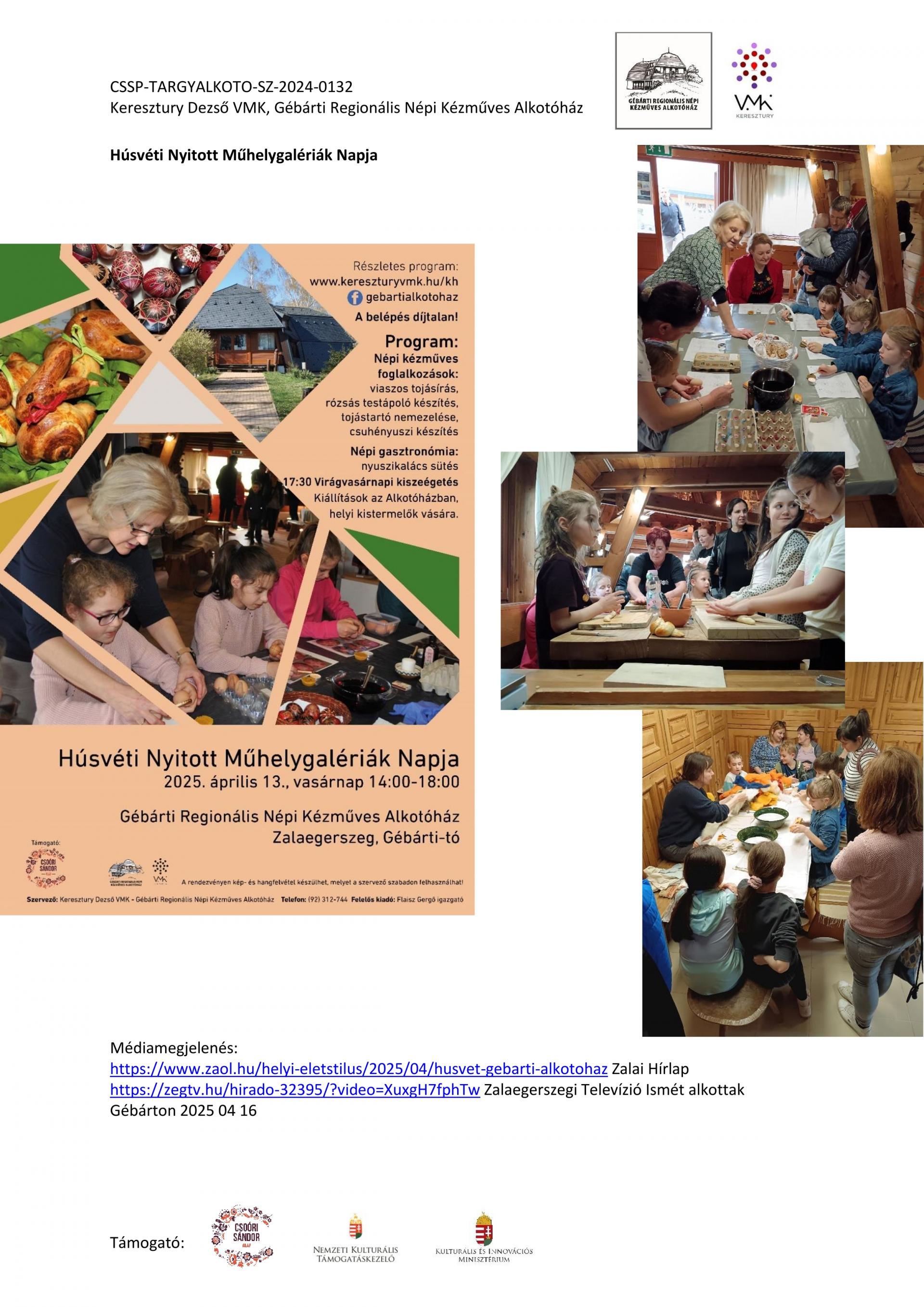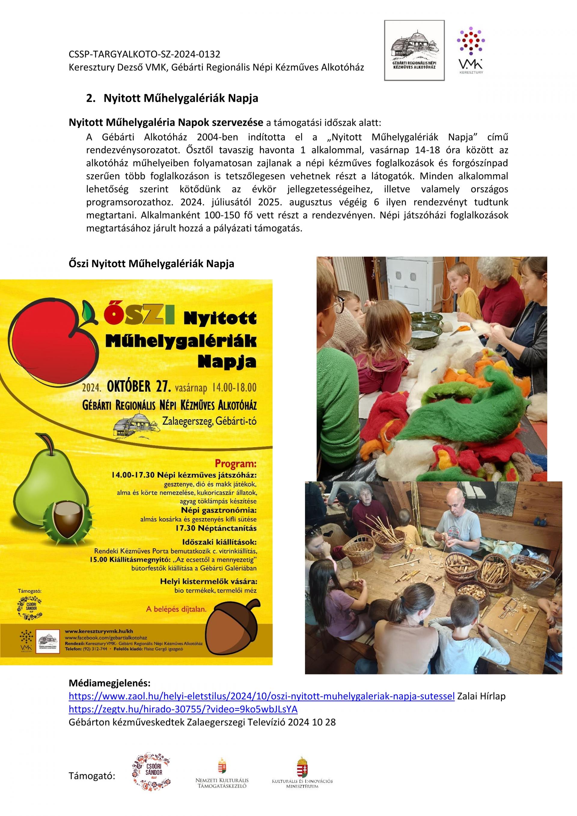 Nyitott Műhelygalérianapok szervezése a támogatási időszak alatt: A Gébárti Alkotóház 2004-ben indította el a „Nyitott Műhelygalériák Napja” című rendezvénysorozatot. Ősztől tavaszig havonta 1 alkalommal, vasárnap 14-18 óra között az alkotóház műhelyeiben folyamatosan zajlanak a népi kézműves foglalkozások és forgószínpad szerűen több foglalkozáson is tetszőlegesen vehetnek részt a látogatók. Minden alkalommal lehetőség szerint kötődünk az évkör jellegzetességeihez, illetve valamely országos programsorozathoz. 2024. júliusától 2025. év augusztusáig 6 ilyen rendezvényt tudtunk megtartani. Ezek visszanézhetőek archívumunkban: Archívum - Keresztury Dezső VMK Zalaegerszeg (kereszturyvmk.hu). Minden alkalomhoz szórólap készült.