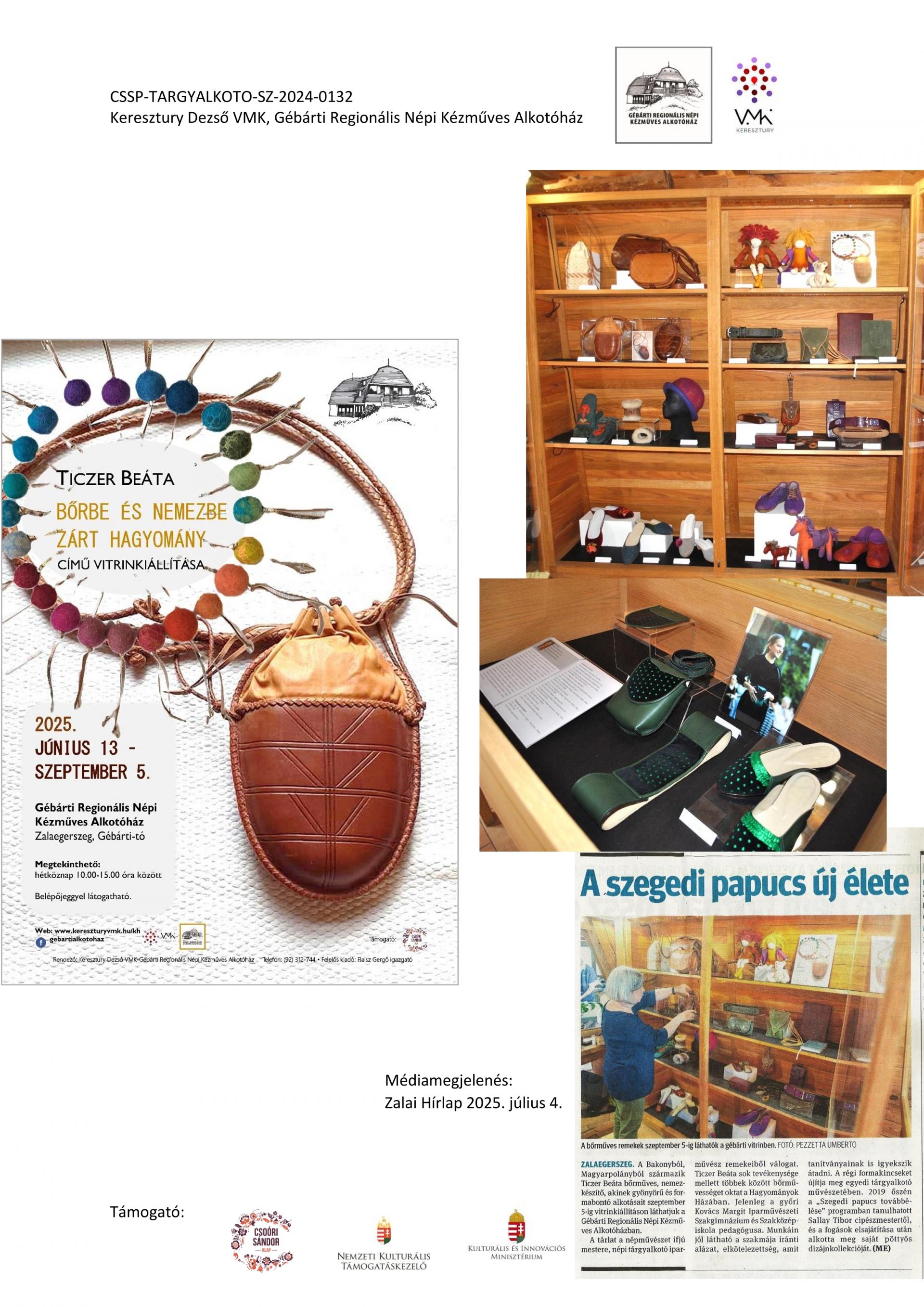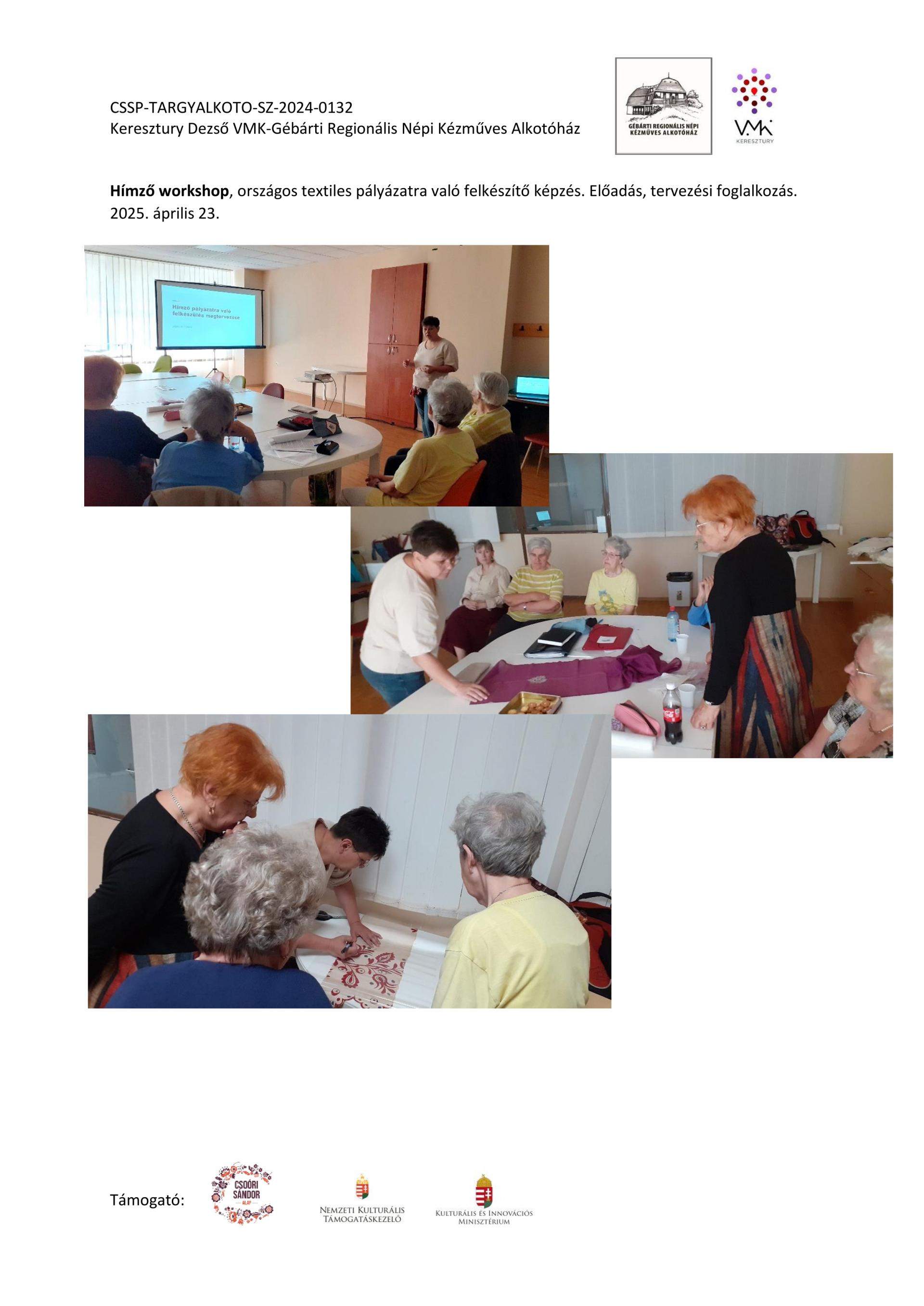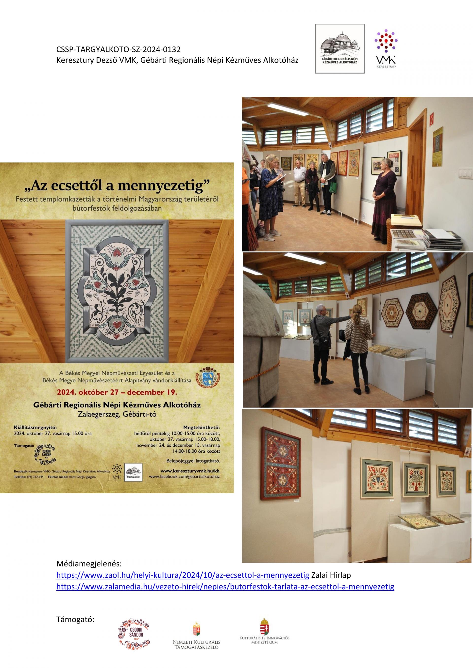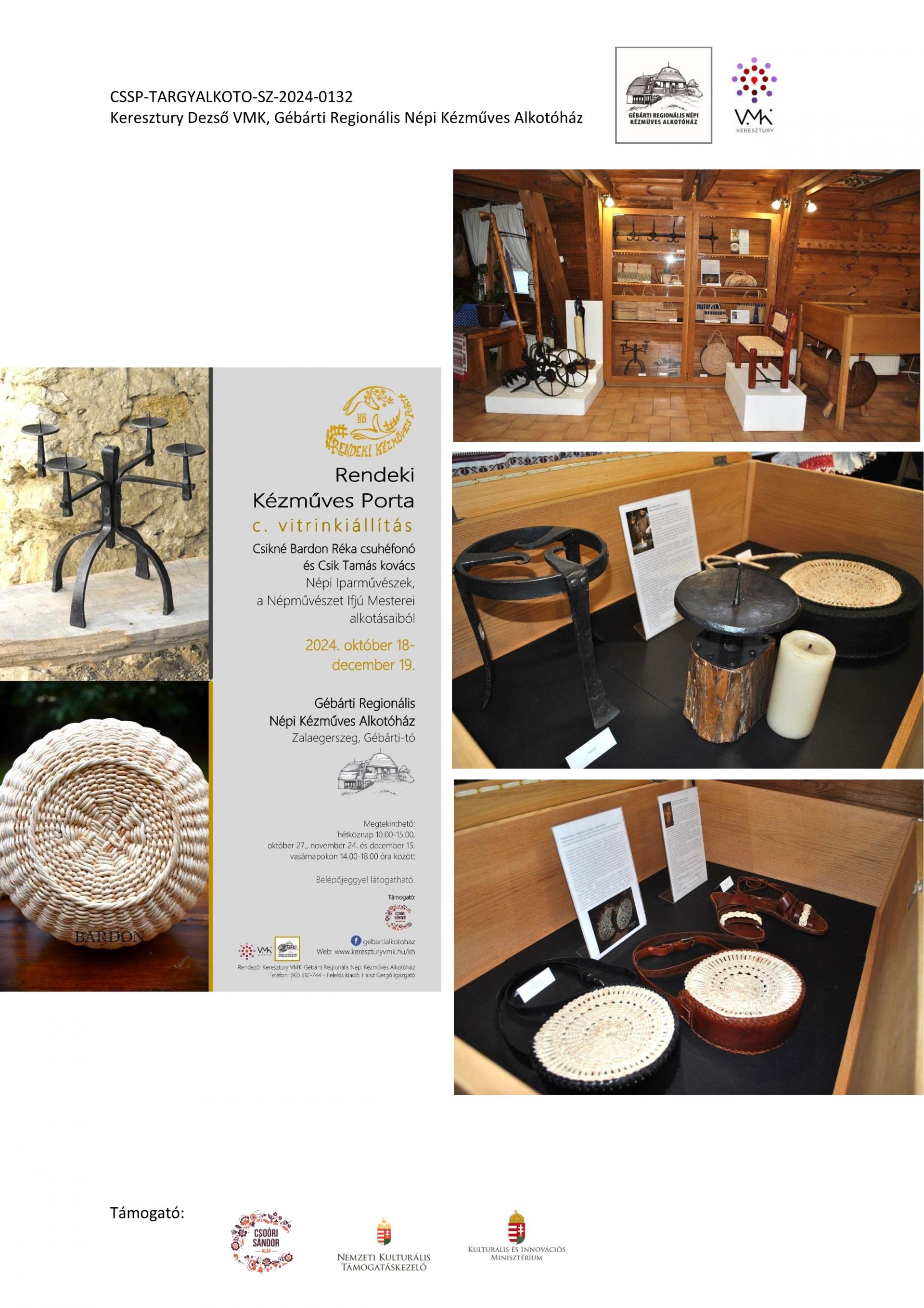 Nyitott Műhelygalérianapok szervezése a támogatási időszak alatt: A Gébárti Alkotóház 2004-ben indította el a „Nyitott Műhelygalériák Napja” című rendezvénysorozatot. Ősztől tavaszig havonta 1 alkalommal, vasárnap 14-18 óra között az alkotóház műhelyeiben folyamatosan zajlanak a népi kézműves foglalkozások és forgószínpad szerűen több foglalkozáson is tetszőlegesen vehetnek részt a látogatók. Minden alkalommal lehetőség szerint kötődünk az évkör jellegzetességeihez, illetve valamely országos programsorozathoz. 2024. júliusától 2025. év augusztusáig 6 ilyen rendezvényt tudtunk megtartani. Ezek visszanézhetőek archívumunkban: Archívum - Keresztury Dezső VMK Zalaegerszeg (kereszturyvmk.hu). Minden alkalomhoz szórólap készült.